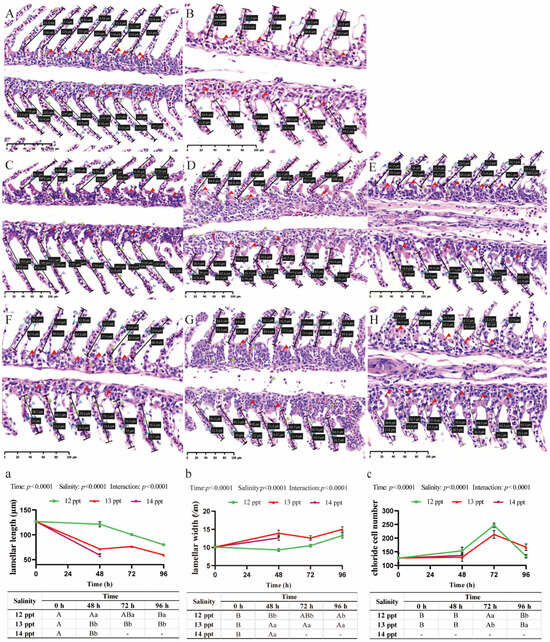 Histopathological alterations and morphometric changes in the gill of Perca schrenkii under acute salinity stress. (A–H) Representative H&E-stained gill sections. (A) Control group. (B) 14 ppt (48 h). (C–E) 12 ppt: (C) 48 h; (D) 72 h; (E) 96 h. (F–H) 13 ppt: (F) 48 h; (G) 72 h; (H) 96 h. Markers: Black double-headed arrows = lamellar length (quantified in (a); blue double-headed arrows = lamellar width (quantified in (b); red flags = chloride cells (quantified in (c). Scale bar = 50 μm (all micrographs). (a–c) Gill parameter dynamics (n = 9, mean ± SE): (a) lamellar length, (b) lamellar width, (c) chloride cell count. Uppercase letters = inter-temporal differences (same salinity); lowercase letters = inter-salinity differences (same time) (Two-way ANOVA, Tukey’s test, p < 0.05). ANOVA results (time, salinity, interaction) are shown in each panel.