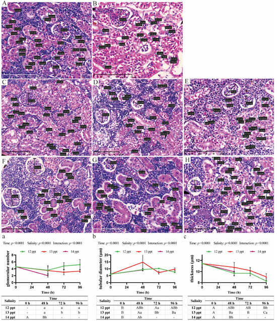 Renal histopathological alterations and morphometric analysis in Perca schrenkii under acute salinity stress. (A–H) Representative H&E-stained kidney sections. (A) Control group. (B) 14 ppt (48 h). (C–E) 12 ppt: (C) 48 h; (D) 72 h; (E) 96 h. (F–H) 13 ppt: (F) 48 h; (G) 72 h; (H) 96 h. Markers: Black double-headed arrows = glomerular longest diameter; blue double-headed arrows = tubular diameter; turquoise double-headed arrows = tubular epithelial thickness. Scale bar = 100 μm (all micrographs). (a–c) Renal morphometric parameter analysis (n = 9, mean ± SE): (a) glomerular number per field, (b) tubular diameter, (c) tubular epithelial thickness. Uppercase letters = inter-temporal differences (same salinity); lowercase letters = inter-salinity differences (same time) (Two-way ANOVA, Tukey’s test, p < 0.05). ANOVA results (time, salinity, interaction) are shown in each panel.