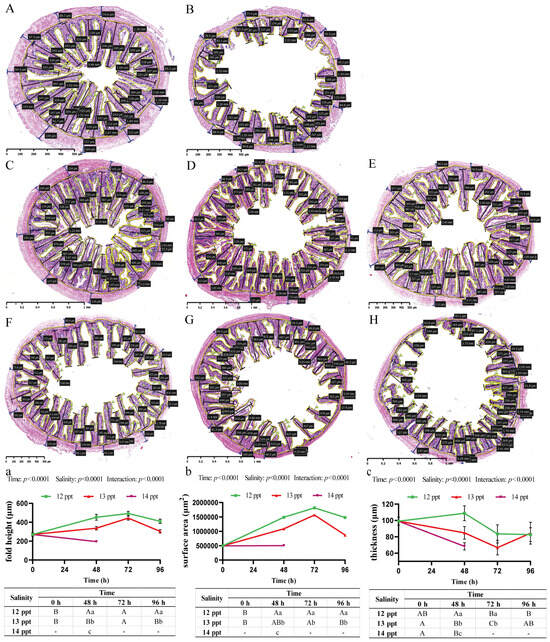 Intestinal histopathological alterations and morphometric analysis in Perca schrenkii under acute salinity stress. (A–H) Representative H&E-stained intestinal sections. (A) Control group. (B) 14 ppt (48 h). (C–E) 12 ppt: (C) 48 h; (D) 72 h; (E) 96 h. (F–H) 13 ppt: (F) 48 h; (G) 72 h; (H) 96 h. Markers: Black double-headed arrows = mucosal fold height; yellow brackets = mucosal fold range; blue double-headed arrows = muscularis thickness; green flags = goblet cells. Scale bar = 200 μm (all micrographs). (a–c) Intestinal morphometric parameter dynamics (n = 9, mean ± SE): (a) mucosal fold height, (b) total mucosal surface area, (c) muscularis thickness. Uppercase letters = inter-temporal differences (same salinity); lowercase letters = inter-salinity differences (same time) (Two-way ANOVA, Tukey’s test, p < 0.05). ANOVA results (time, salinity, interaction) are shown in each panel.