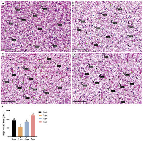Morphometric analysis of hepatocyte area (Figure 8A–D) revealed a notable biphasic response. Compared to the control group, hepatocyte area significantly decreased at 3 ppt. However, at 5 ppt, the area rebounded to a level comparable to the control, before increasing markedly at 7 ppt, which was significantly larger than all other groups (Figure 8a).