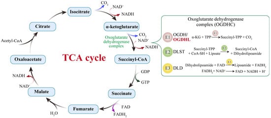 The tricarboxylic acid (TCA) cycle is a central hub of mitochondrial metabolism, providing the main pathway that oxidizes carbohydrates, fats, and amino acids to obtain the energy to maintain cerebral functions [1]. The 2-oxoglutarate dehydrogenase complex (OGDHC) is the rate-limiting enzyme of the TCA cycle, influencing both ATP production and the synthesis of critical metabolic intermediates [11,12,13]. OGDHC, also known as the α-ketoglutarate dehydrogenase complex (KGDHC), comprises three catalytic enzyme components: E1o, thiamine diphosphate (ThDP)-dependent 2-oxo acid dehydrogenase; E2o, dihydrolipoyl acyl transferase; and E3, dihydrolipoyl dehydrogenase. These subunits work sequentially within the multienzyme complex to convert α-ketoglutarate (α-KG) into succinyl-CoA and generate ATP and NADH through oxidative phosphorylation [11,13,14] (Figure 1). Oxoglutarate dehydrogenase-like (OGDHL) is the isoenzyme of OGDH, which encodes the catalytic core subunit of the OGDHC. Both OGDH and OGDHL participate in the rate-limiting step that catalyzes the oxidative decarboxylation of 2-oxo acids. In contrast to the ubiquitously expressed OGDH, OGDHL exhibits a restricted expression profile, with particularly high levels in the central nervous system [15,16]. Mutations in OGDHL have been linked to a range of neurodevelopmental disorders, underscoring its specialized role in maintaining neuronal function and survival [17].