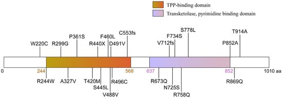In recent years, advances in high-throughput sequencing technologies, particularly whole-exome sequencing and whole-genome sequencing, have greatly facilitated the identification of pathogenic mutations in rare neurodevelopmental disorders, including those linked to OGDHL. To date, 21 distinct pathogenic variants in OGDHL have been reported across unrelated families [17,27,28], causing a spectrum of neurological and neurodevelopmental disorders, including epilepsy, hearing loss, visual impairment, gait ataxia, microcephaly, and hypoplasia of the corpus callosum. These can be classified into three groups according to the affected protein domain and mutation type: homozygous point mutations in the TPP-binding domain, homozygous point mutations in the transketolase domain, and compound heterozygous mutations. In this section, we provide a summary of the reported OGDHL mutations and their associated clinical phenotypes (Figure 2, Table 1).
