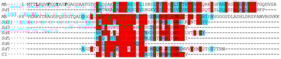 - Sievers, F.; Wilm, A.; Dineen, D.; Gibson, T.J.; Karplus, K.; Li, W.; Lopez, R.; McWilliam, H.; Remmert, M.; Söding, J.; et al. Fast, scalable generation of high-quality protein multiple sequence alignments using Clustal Omega. Mol. Syst. Biol. 2011, 7, 539. [Google Scholar] [CrossRef]