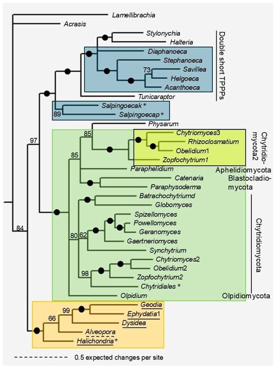 Phylogenetic tree of fungal and ‘double’ type TPPPs by Bayesian analysis. Two independent analyses were run for 2.1 × 10−6 generations. The root of the tree was chosen arbitrarily. The accession numbers of proteins/TSAs are listed in Table S2. Black circles at a node indicate that the branch was supported by maximal Bayesian posterior probability (BPP). All the other branches were supported by BPP as indicated at the node. Color code: Porifera and Cnidaria (orange), Fungi (green), Choanoflagellata (blue). A special fungal group (Chytriomycota2) is indicated by a yellow box. Asterisks label double long TPPPs.