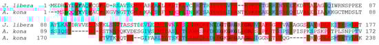 Sequence alignment of J. libera (EC692700) and A. kona (KAL0476604) TPPPs. Red and blue backgrounds indicate identical and biochemically similar amino acids.