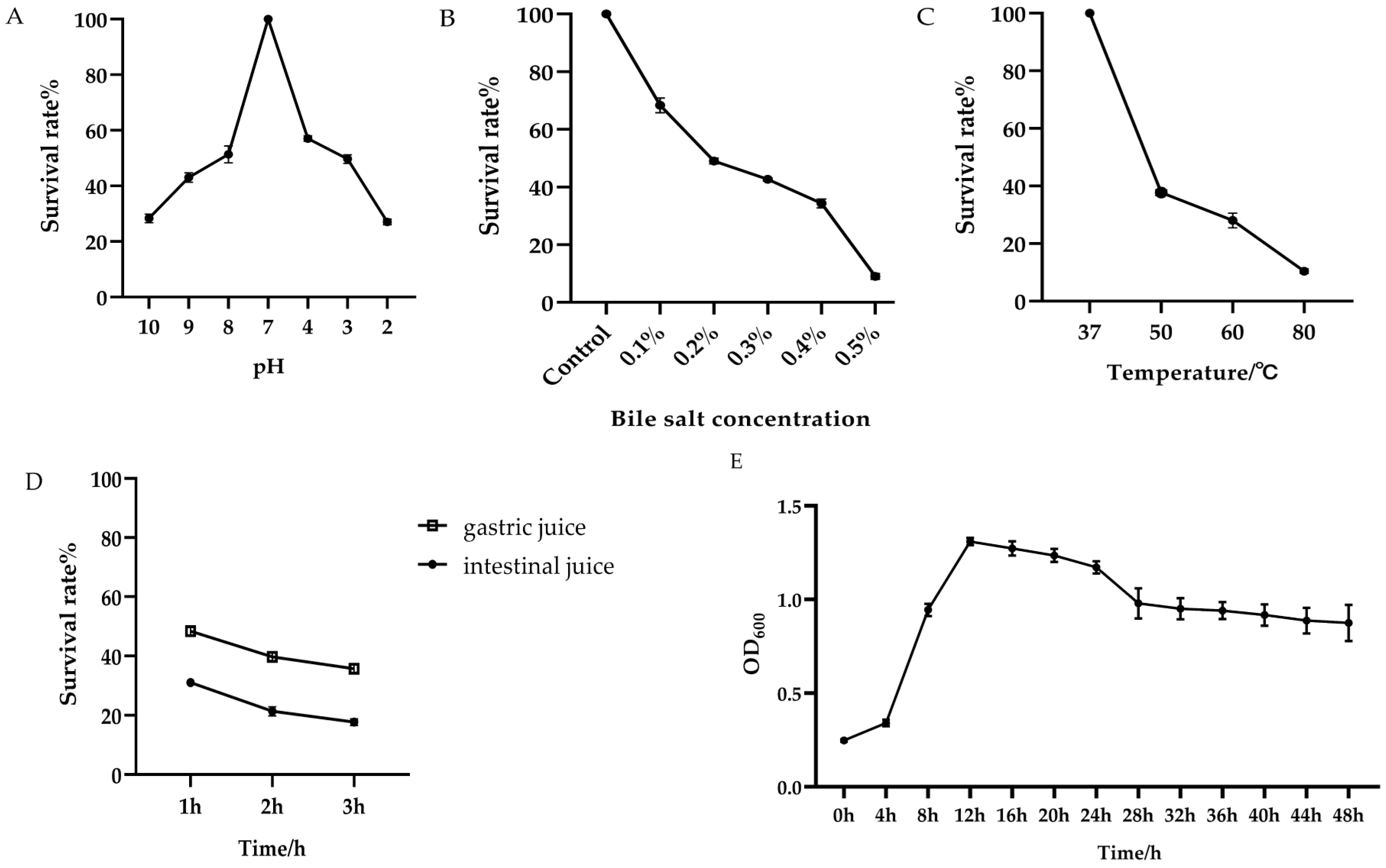 3.2. The Growth Curve and Stress Resistance of the Bacillus subtilis Isolated