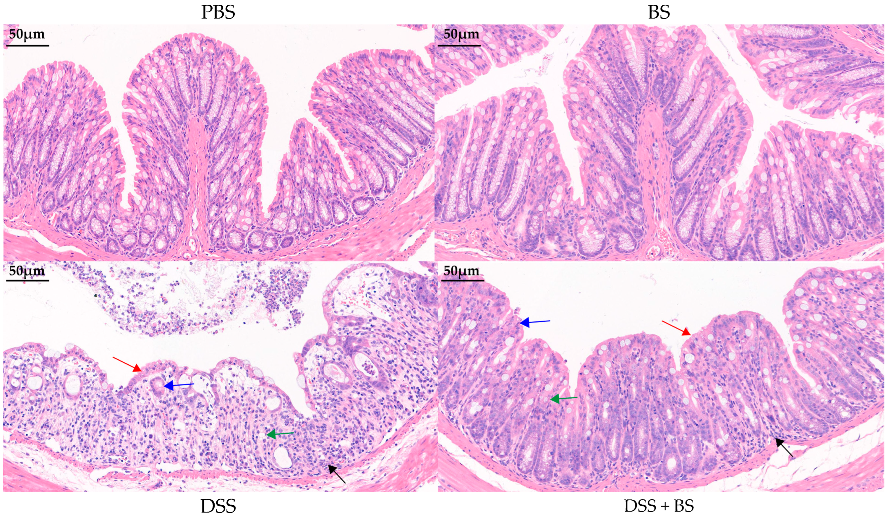 3.5.2. The Effect of Bacillus subtilis on Pathological Changes in Colonic Histology