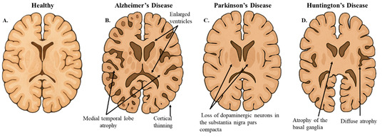 HD, in contrast to AD and PD, is a rarer but highly severe neurodegenerative disorder with a global prevalence of 0.48 per 100,000 person-years (2010–2022), and a U.S. prevalence of 1.76 per 100,000 person-years in the same period [48]. Unlike AD and PD, HD follows an autosomal dominant inheritance pattern and presents earlier in life, typically between 30 and 50 years [49,50]. HD is primarily characterized by progressive motor, cognitive, and psychiatric impairments [51]. Markedly, the frontostriatal circuits are among the earliest and most consistently affected brain regions in HD, followed by more widespread atrophy of the frontal and temporal regions, and eventually deeper subcortical structures, including the limbic system and cerebellum (Figure 2D) [52,53].