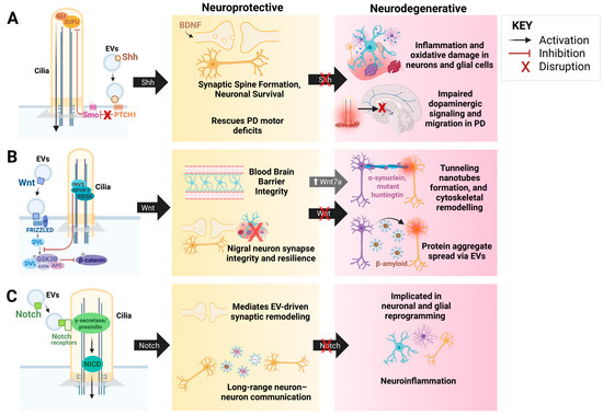 The Interplay Between EVs, TNTs, and Ciliary Signaling Pathways: Shh, Wnt, and Notch. This figure represents the functional interactions between EVs, TNTs, and ciliary-mediated signaling pathways, demonstrating their dual roles in neuronal maintenance and neurodegenerative disorders. (A). Shh signaling promotes synaptic spine formation and neuronal survival via EV-associated brain-derived neurotrophic factor (BDNF), rescuing dopaminergic neuron loss and motor deficits in PD. Dysregulation of Shh signaling impairs dopaminergic signaling and migration, contributing to inflammation, oxidative stress, and neuronal degeneration. (B). Wnt signaling pathway maintains blood-brain barrier integrity, synaptic resilience, and nigral neuron survival. Abnormal Wnt activity, via the Wnt7a pathway, facilitates tunneling nanotube formation, cytoskeletal remodeling, and EV-mediated propagation of protein aggregates (α-syn, Aβ, mutant huntingtin), linking this pathway to the spread of neurotoxin proteins and neuroinflammation seen in NDDs. (C). Notch signaling mediates EV-driven synaptic remodeling and neuron-neuron communication. Dysregulated Notch signaling may contribute to glial and neuronal reprogramming and neuroinflammation during neurodegeneration. Created in BioRender. Chen, G. (2025) https://BioRender.com/3h40i7a [290].