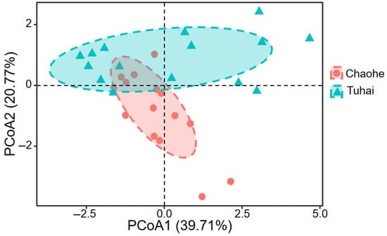 A two-kilometer buffer zone was delineated along each riverbank to quantify the land use composition. Marked differences in land cover types were observed between the Tuhai River and the Chao River (Table S2). Farmland was the dominant land use type along both rivers, making up 67.47% of the total buffer area for the Chao River and 74.87% for the Tuhai River. The proportion of impervious surfaces was slightly higher along the Chao River (20.78%) than along the Tuhai River (18.65%). Both rivers displayed minimal coverage of grassland and bare land, with each constituting less than 1% of the buffer area. Overall, the Tuhai River exhibited significantly greater proportions of farmland and impervious surfaces than the Chao River, reflecting more intensive agricultural and urban land use. Natural landform types made up very low proportions in both river systems. PCoA based on the Bray–Curtis distance revealed a clear difference in water quality parameters between the two rivers (Figure 2). The Tuhai River exhibited higher concentrations of EC, COD, and BOD5, whereas the Chao River generally exhibited elevated levels of TN, NH4-N, and TP (Table S3).