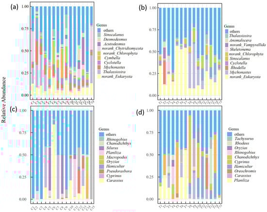 The relative sequence abundances of the top 10 dominant species at the genus level. (a,b) The relative abundances of plankton species in the Chao River and the Tuhai River. (c,d) The relative abundances of fish species in the Chao River and the Tuhai River.