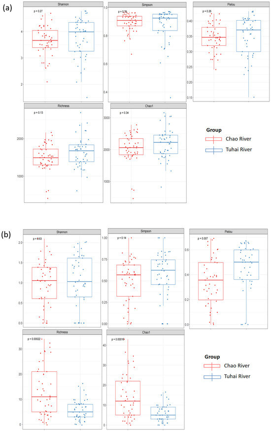 To further quantify the differences in community diversity between the two rivers, we calculated five alpha diversity indices for both the eukaryotic plankton and fish communities: the Shannon index, the Simpson index, Pielou’s evenness, Chao1, and observed species richness (Figure 4). Because these indices are derived from relative sequence read data, they are interpreted here as community-level proxies of compositional structure rather than precise quantitative measures of absolute abundance or biomass. No significant differences in α-diversity were observed for plankton communities (Figure 4a). The Shannon index (p = 0.27), the Simpson index (p = 0.70), Pielou’s evenness (p = 0.26), Chao1 (p = 0.34), and observed species richness (p = 0.13) did not differ significantly between the two rivers. For fish communities, diversity indices describing dominance structure did not differ significantly between rivers: the Shannon (p = 0.63) and Simpson indices (p = 0.14) were similar in the Chao and Tuhai Rivers (Figure 4b). In contrast, Pielou’s evenness (p = 0.007), Chao1 richness estimate (p = 0.00016), and observed richness (p = 0.00022) were all significantly higher in the Chao River than in the Tuhai River. These results suggest that although overall diversity levels were similar, the fish community in the Chao River exhibited greater evenness in species distribution and higher taxonomic richness. In contrast, planktonic communities showed greater consistency in both diversity and abundance between the two rivers.