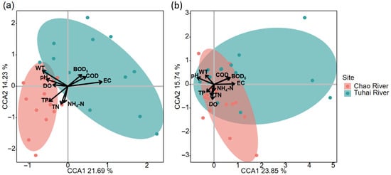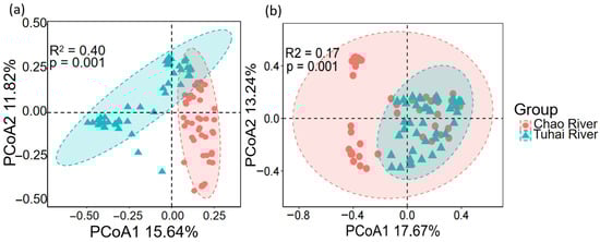 PCoA of communities at different trophic levels in the Chao River and the Tuhai River: (a) the plankton community and (b) the fish community.