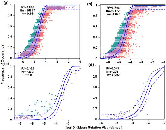 The Neutral Community Model fitting for plankton and fish communities. (a) The plankton community in the Chao River. (b) The plankton community in the Tuhai River. (c) The fish community in the Chao River. (d) The fish community in the Tuhai River. Factors occurring more or less frequently than predicted using the neutral model are shown in green and pink, respectively.Purple dots indicate taxa that fit the neutral model prediction. Dashed lines represent 95% confidence intervals around the model prediction (solid line). R2 values indicate the model’s fit and m indicates the estimated migration rate.
