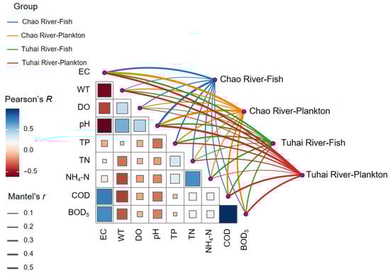 CCAs and Mantel tests were performed to identify key environmental factors influencing the structures of the plankton and fish communities in the two rivers (Figure 8). For fish communities, CCA revealed a clear separation of samples along environmental gradients, with the first two axes explaining 23.85% and 15.74% of the total variance, respectively. Six water quality parameters, namely EC, WT, pH, COD, BOD5, and DO, showed significant correlations with fish community composition (p < 0.05), indicating that these physicochemical factors play a dominant role in shaping the fish community structure. For plankton communities, CCA indicated stronger and more comprehensive environmental responses. The first two axes explained 21.69% and 14.23% of the variance, respectively. All nine measured water quality parameters, namely, EC, WT, TN, TP, pH, NH4-N, COD, BOD5, and DO, were significantly correlated with plankton structure (p < 0.05), demonstrating broader environmental sensitivity and a pronounced influence of nutrient gradients on plankton assembly.