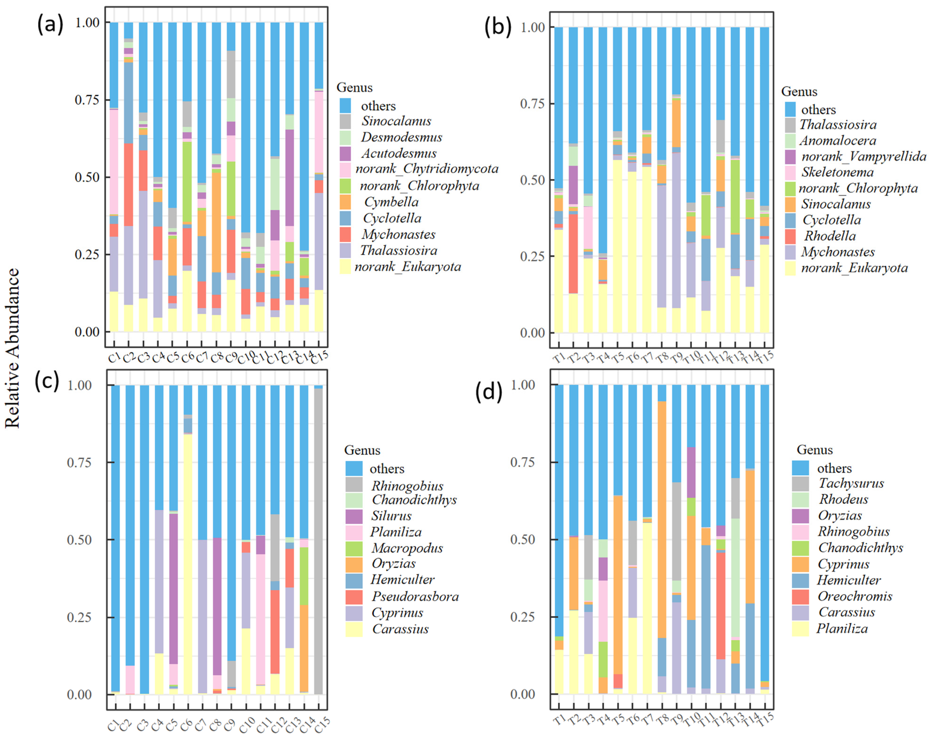 - Wang, S.; Gu, S.; Zhang, Y.; Deng, Y.; Qiu, W.; Sun, Q.; Zhang, T.; Wang, P.; Yan, Z. Microeukaryotic Plankton Community Dynamics under Ecological Water Replenishment: Insights from eDNA Metabarcoding. Environ. Sci. Ecotechnol. 2024, 20, 100409. [Google Scholar] [CrossRef]