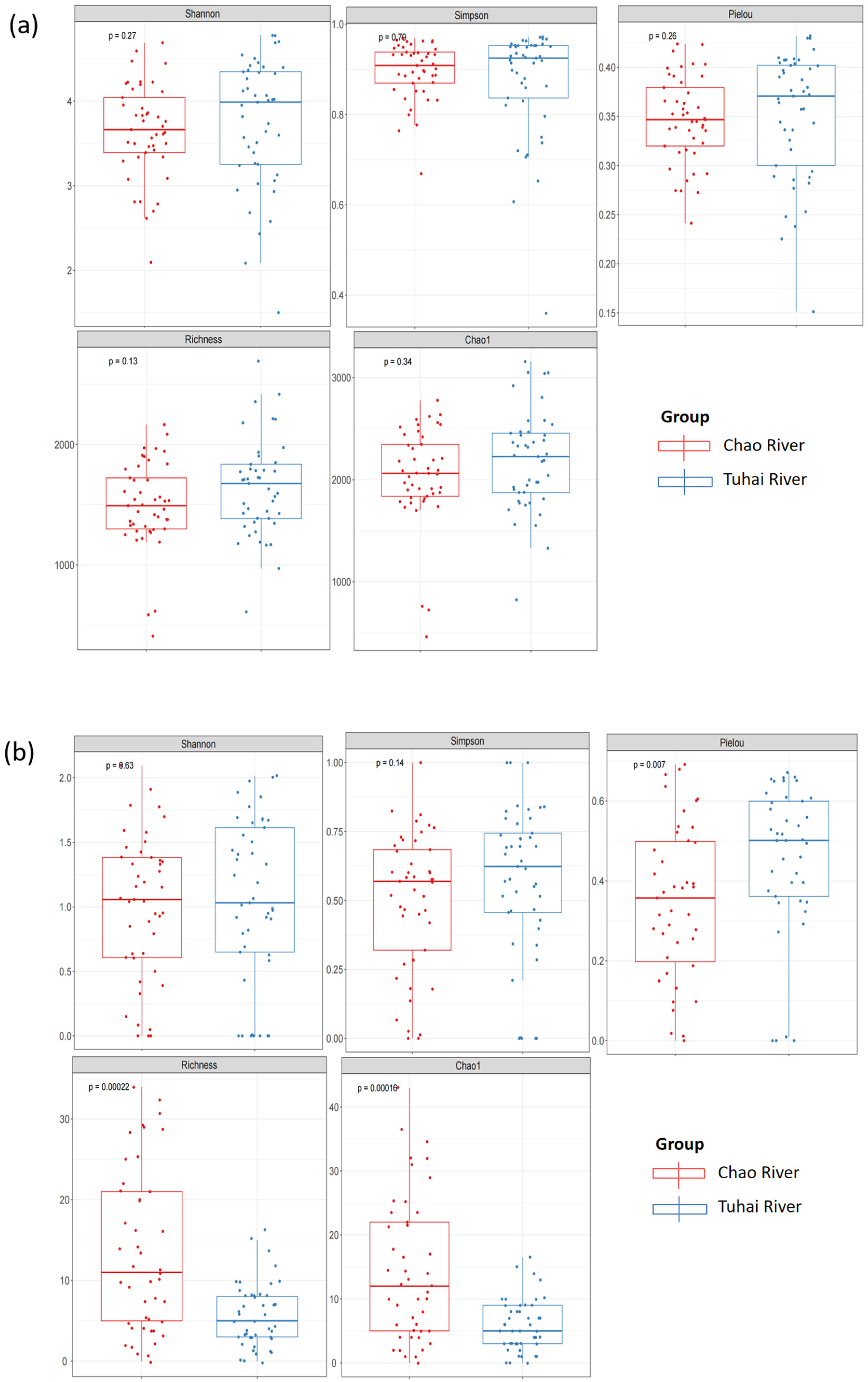 4.1. Minimal Inter-River Variation in α-Diversity Despite Contrasting Environmental Conditions