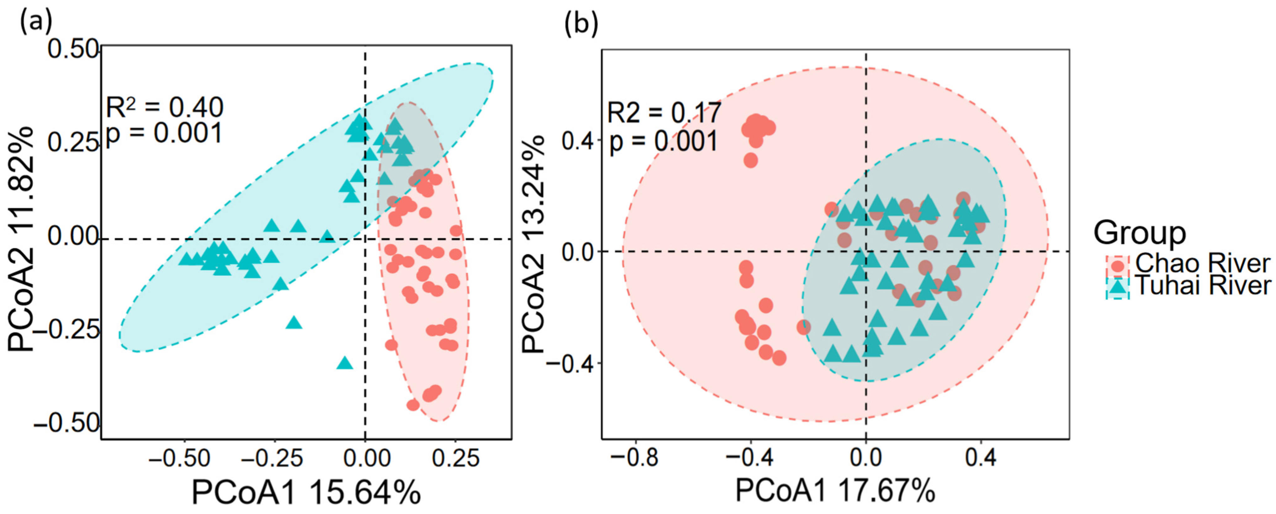 4.2. Phytoplankton Communities Show Stronger River-Specific Differentiation and Spatial Turnover Under Contrasting Environmental Conditions