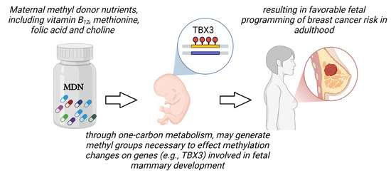 DNA methylation reactions are known to depend on methyl groups generated by one-carbon metabolism, a pathway that, in turn, relies on the availability of methyl donor nutrients (MDNs) such as vitamin B12 and folic acid. Interestingly, researchers have previously shown that maternal diet supplemented with MDN (including vitamin B12, methionine, choline, and folic acid) lowers the susceptibility of offspring to developing chemically induced breast cancer [9,10]. These findings suggest that maternal MDN reduces the offspring’s susceptibility to developing mammary tumors, partly through epigenetic modification of genes involved in cellular growth.