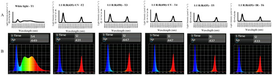 The spectra of the lighting treatments were assessed, using a UPRtek spectrophotometer, measuring (A) the radiant density of the light spectrum intensity and (B) the relative light intensity (T1: (50% cool white + 50% warm light), T2: Red: 663: Blue: 435 + UV365 1:1, T3: Red: B450 1:1, T4: Red: B450 + UV 1:1, T5: Red: B435 1:1, T6: Red: B435 + IR 1:1).