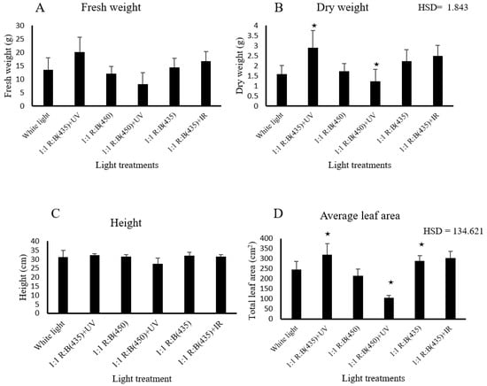 The effect of light treatment on growth: (A) fresh weight (g), (B) dry weight (g), (C) plant height (cm), (D) average leaf area of the top five leaves of S. rebaudiana at the harvest stage (5 weeks after obtaining the cuttings from mother plants). ★ means the treatment is ≥ HSD and there is a significant difference between treatments.