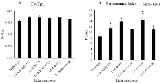 The effect of light treatment on health traits: (A) chlorophyll fluorescence parameter (Fv/Fm), (B) performance index of S. rebaudiana at the harvest stage. ★ means the treatment is ≥ HSD and there is a significant difference between treatments.