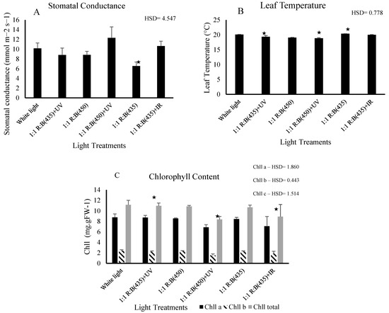 The effect of light treatments on the (A) chlorophyll content, (B) stomatal conductance, and (C) leaf temperature of S. rebaudiana. The impacts were significantly different in all 6 light treatments (p < 0.05) for the chlorophyll contents of Chll a, Chll b, and Chll c, stomatal conductance, and leaf temperature. ★ means the treatment is ≥ HSD and there is a significant difference between treatments.