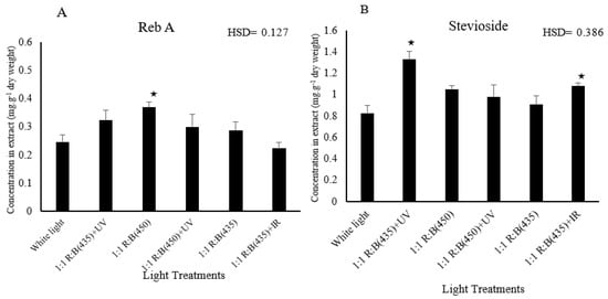 Effect of light treatment on the components of sweetness: reb A (A) and stevioside (B) of S. rebaudiana. ★ means the treatment is ≥ HSD and there is a significant difference between treatments.
