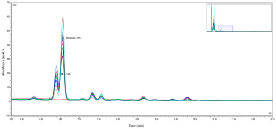 - Aranda-González, I.; Moguel-Ordoñez, Y.; Betancur-Ancona, D. Determination of rebaudioside A and Stevioside in leaves of S. rebaudiana Bertoni grown in México by a validated HPLC method. Am. J. Anal. Chem. 2015, 6, 878. [Google Scholar] [CrossRef]