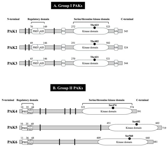 The p21-activated kinases (PAKs) are a conserved family of serine/threonine protein kinases, which are well-established effectors for the small GTPases, Rho GTPase Cdc42 and Rac [1,2]. The PAK family consists of six members that are divided into two subgroups according to their sequence homology and structural and activation characteristics: group I (PAK1–3) and group II (PAK4–6) [1,2,3] (Figure 1).
