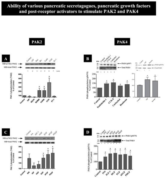 Ability of various pancreatic secretagogues, pancreatic growth factors and post-receptor activators to stimulate activation of PAK2 (A,C) and PAK4 (B,D) (i.e., measured by detecting phosphorylation of T402 and S474, which has been shown to be essential for PAK2 and PAK4 protein kinase activity, respectively [9,29,85,86,87,88]) in rat pancreatic acini. (A,B) Ability of various pancreatic acinar secretagogues [10,14,15,79,83] [cholecystokinin (CCK-8, 1 nM, 1 min), carbachol (10 uM, 1 min), bombesin (1 nM, 1 min), vasoactive intestinal peptide (VIP) (10 nM, 1 min), secretin (10 nM, 1 min) or endothelin-1 (10 nM, 1 min)] to activate PAK2 or PAK4 in isolated pancreatic acini. (C,D) Ability of various pancreatic growth factors [10,14,15,79,83] [insulin (INS, 1 uM, 10 min), insulin-like growth factor 1 (IGF-1, 100 nM, 10 min), hepatocyte growth factor (HGF, 1 nM, 10 min), epidermal growth factor (EGF, 10 nM, 5 min), basic fibroblast growth factor (bFGF, 100 ng/mL, 5 min) and platelet-derived growth factor (PDGF, 100 ng/mL, 10 min)] to activate PAK2 or PAK4 in the pancreatic acini. Isolated pancreatic acini were incubated in the absence or presence of these pancreatic secretagogues, pancreatic growth factors and post-receptor activators at the indicated concentrations and time incubations and then lysed. The cell lysates were subjected to Western blotting and analyzed using anti-pT402 PAK2 or anti-pS474 PAK4 and, as loading control, anti-total PAK2 or PAK4. Bands were visualized using chemiluminescence and quantified by densitometry. Results are expressed as % control phosphorylation. Top: Results of a representative blot of five independent experiments. Bottom: Mean ± SE of six independent experiments. *, p < 0.05 compared with the control. These results are modified from the figures and data in [10,14,15]. These results show that various pancreatic growth factors and secretagogues can activate both PAK2 and PAK4 in pancreatic exocrine tissue, but they are similar with some stimulants and differ with others.
