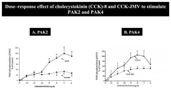 Dose–response effect of cholecystokinin (CCK)-8 and CCK-JMV (a synthetic CCK analog that distinguishes high/low affinity CCK1-R receptor states [10,14,89,90,91]) to activate PAK2 (A) and PAK4 (B) (i.e., measured by detecting phosphorylation of T402 and S474, which has been shown to be essential for PAK2 and PAK4 protein kinase activity, respectively [9,29,85,86,87,88], in rat pancreatic acini. Isolated pancreatic acini were incubated in the absence or presence of CCK-8 and CCK-JMV (at the indicated concentrations) for 3 min and then lysed. Results are expressed as means ± SE of three independent experiments. Results are expressed as % of basal stimulation of the control group (PAK2: CCK-8 100 nM; 904 ± 140% of control. PAK4: CCK-8 1 nM; 193 ± 15% of control). * p < 0.05 compared with the control. These results are modified from the figures and data in [10,14]. These results show that both activation of the high and the low affinity CCK1-R receptor states are need for full activation of either PAK2 or PAK4 by CCK.