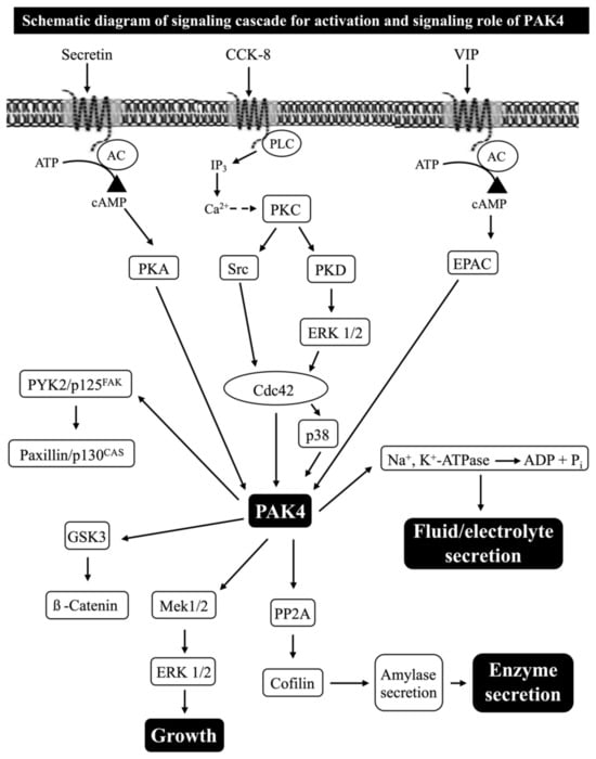 Schematic diagram summarizing the signaling cascade for activation and signaling role of PAK4 in response to CCK, secretin or VIP from recent studies [14,41,143] in rat pancreatic acinar cells. Maximal activation of PAK4 by CCK-8 (i.e., measured by detecting phosphorylation of S474, which has been shown to be essential for PAK4 protein kinase activity, as well as reflecting its degree of activation, Refs. [9,29]), requires activation of primarily PKC, with a lesser contribution by changes in cytosolic calcium. PKC mediates both Src family kinase (SFK) and protein kinase D (PKD) activation with the latter resulting in ERK1/2 activation and Cdc42 activation. This in turn can stimulate PAK4 activation partially via a p38 mechanism [14]. However, changes in PI3K are not involved in pancreatic acini in contrast to what is reported in a number of other tissues with other stimulants [45,144]. The ERK1/2 and PAK4 inhibition studies demonstrate that CCK-8-mediated ERK1/2 activation and PAK4 activation reciprocally regulate each other’s activation [14]. Activation of PAK4 by secretin in pancreatic acinar cells requires activation of PKA and by VIP requires EPAC; however, both secretin and VIP induced CREB phosphorylation through EPAC. PAK4 activation is important for Na+, K+-ATPase phosphorylation, and Na+, K+-ATPase activity [15]. Activation of PAK4 is needed to stimulate several signaling kinases including MAPKs (Mek1/2 and p44/42), FAKs (p125FAK and PYK2); scaffolding proteins (paxillin and p130CAS); GSK3 and ß-Catenin; and PP2A and cofilin, which are important in mediating numerous cellular functions [14,40,41]. These results are drawn from the figures and data in [14,15,40,41]. These results show that the signaling cascades for secretin, CCK and VIP mediated the PAK4 activation and stimulation of acinar growth, enzyme secretion and fluid/electrolyte secretion. It is unknown what role, if any, PAK4 plays in CCK-induced experimental pancreatitis.