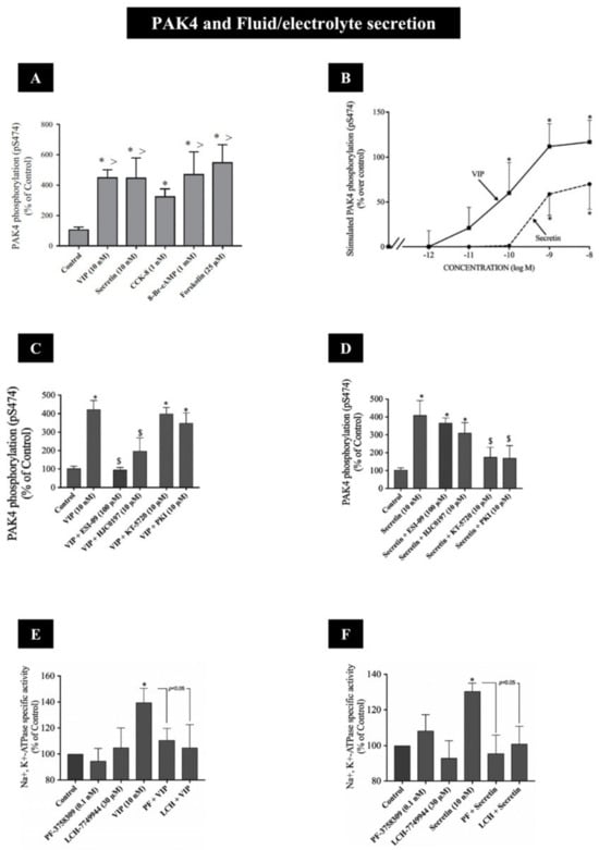 (A) Effect of VIP, secretin, CCK-8, 8-Br-cAMP and forskolin on PAK4 activation in rat pancreatic acini. Isolated pancreatic acini were incubated in the absence or presence of VIP (10 nM), secretin (10 nM), 8-Br-cAMP (1 mM) or forskolin (25 uM) for 15 min and CCK-8 (1 nM) for 3 min and then lysed. (B) Dose–response effect of VIP and secretin to stimulate PAK4 activation in rat pancreatic acini. Isolated pancreatic acini were incubated in the absence or presence of VIP and secretin (at the indicate concentrations) for 15 min and then lysed. (C,D) Effect of ESI-09 and HJC0197, EPAC inhibitors, and KT-5720 and PKI, PKA inhibitors, on PAK4 activation by VIP (C) and secretin (D) in rat pancreatic acini. Isolated pancreatic acini were incubated in the absence or presence of ESI-09 (100 uM), HJC0197 (10 uM, 2h), KT-5720 (10 uM) or PKI (10 uM) for 1 h and then incubated with no addition (control) or secretin (10 nM) for 15 min and then lysed. (E,F) Effect of PF-3758309 and LCH-7749944, PAK4 inhibitors, on VIP (E) and secretin (F) stimulation of Na+, K+-ATPase activity rat pancreatic acini. Isolated pancreatic acini were incubated in the absence or presence of PF-3758309 (0.1 nM) and LCH-7749944 (30 uM) for 3 h and then incubated with no addition (control), VIP (10 nM) or secretin (10 nM) for 15 min and then lysed. PAK4 was measured by detecting phosphorylation of S474, which has been shown to be essential for PAK4 protein kinase activity [9,29]) and Na+, K+-ATPase activity was measured using a colorimetric assay [190]. Results are expressed as means ± SE of 4 independent experiments. Results are expressed as percentages of basal stimulation of the control group in (A,C–F), and results are expressed as percentages of stimulation over the control group in (B) (VIP 10 nM: 217 ± 24% of control). *, p < 0.05 compared with the control; >, p < 0.05 compared with CCK-8 alone; $, p < 0.05 compared with secretin or VIP alone. These results are modified from the figures and data in [15]. These results show that CCK, VIP and secretin can all activate PAK4 in pancreatic exocrine tissue; however, their cellular signaling cascades differ (see Figure 5).