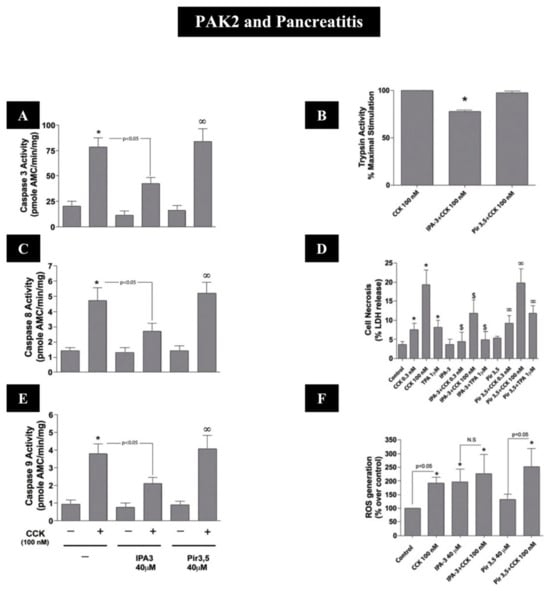 Furthermore, the activation of reactive oxygen species [ROS] has been reported to play an important role in the pathobiology of acute pancreatitis in various disease models [198,204,205], and this was also found to be dependent on the activation of PAK2 [12] (Figure 4 and Figure 7F and Table 2). In addition, in the supramaximal CCK model as well as other models of acute pancreatitis, acinar cell death can occur and is mediated by the activation of apoptosis and necrosis [198,206,207]. For the stimulation of apoptosis in acute pancreatitis, the activation of caspases 3, 8 and 9 plays an essential role, and, in this recent study [12], the activation of these caspases required the activation of PAK2 (Figure 4 and Figure 7A,C,E and Table 2). Furthermore, the activation of PAK2 was an important mediator of necrosis in this model of acute pancreatitis (Figure 4 and Figure 7B,D and Table 2) [12]. The authors of this study [12] propose that because of the multiple roles of PAK2 in the pathobiology of experimental acute pancreatitis, PAK2 could be an important therapeutic target for the treatment of acute pancreatitis.