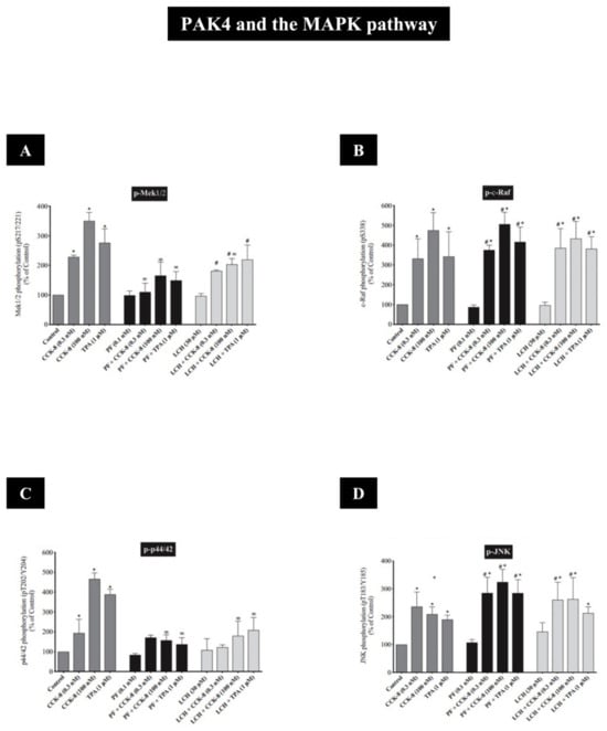 Effect of the PAK4 inhibitors, PF-3758309 and LCH-7749944 on the ability of physiological (0.3 nM) and supraphysiological concentrations of CCK (100 nM) and TPA to activate Mek 1/2 (A), c-Raf (B), p42/44 (C) and JNK (D). Isolated pancreatic acini were incubated in the absence or presence of PF-3758309 (0.1 nM) or LCH-7749944 (30 uM) for 3 h and then incubated with no addition (control) or CCK-8 (0.3 and 100 nM) for 3 min or TPA (1 uM) for 5 min and then lysed. Mek 1/2, c-Raf, p42/44 and JNK phosphorylation were measured by using anti-pS217/221 Mek1/2, anti-pS338-Raf, anti-pY202/204 p42/44 and anti-pT183/Y185 JNK, respectively [41]. Results are expressed as a percentage of basal stimulation of the control group. *, p< 0.05 compared with the control group; #, p < 0.05 compared with inhibitors alone (PF-3758309 or LCH-7749944); ∞, p < 0.05 compared with stimulants without inhibitors. These results are drawn from the figures and data in [41]. These results demonstrate that PAK4 activation is essential for CCK activation of the p42/44 MAPK, which plays a pivotal role in CCK induced acinar cell growth (adaptive growth, growth due to injury and regenerative growth after resection), as well as in CCK activation of Mek 1/2, but, in contrast to PAK2 activation, it does not play a role in CCK activation of c-Raf or JNK.