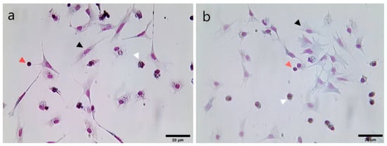 Morphological observation of hemocytes in two species of abalone by Giemsa staining: (a) H. diversicolor supertexta hemocytes; (b) H. discus hannai hemocytes. Black arrowheads indicate granulocytes, white arrowheads indicate hyalinocytes, and red arrowheads indicate blast-like cells.
