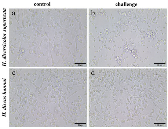 The extracted H. diversicolor supertexta and H. discus hannai hemolymph were inoculated into 12-well cell culture plates (LABSELECT, Shanghai, China) at 500 μL (1 × 106 cells mL−1) per well. Following a 24 h culture period, the cells were fixed with 0.4% paraformaldehyde (Sagon Botech, Shanghai, China) for 15 min. Thereafter, the cells were washed twice in phosphate-buffered saline (pH 7.4) and then stained with Giemsa staining solution (Beyotime Biotechnology, Shanghai, China). Following the completion of the staining process, the hemocytes were examined and photographed using a Nikon Eclipse E80i light microscope (Nikon, Tokyo, Japan) [19].