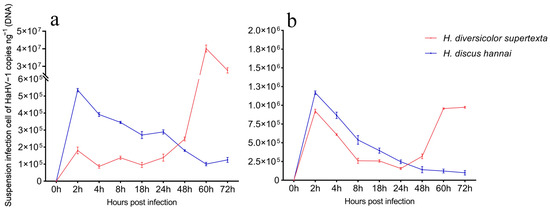 The change in HAHV-1 copies in infected hemocytes and hemolymph under in vitro conditions. (a) The change in HAHV-1 copies of H. diversicolor supertexta and H. discus hannai hemocytes, respectively; (b) The change in HAHV-1 copies of H. diversicolor supertexta and H. discus hannai hemolymph, respectively. The error bars indicate the standard deviation (SD) of the mean of HAHV-1 DNA load.