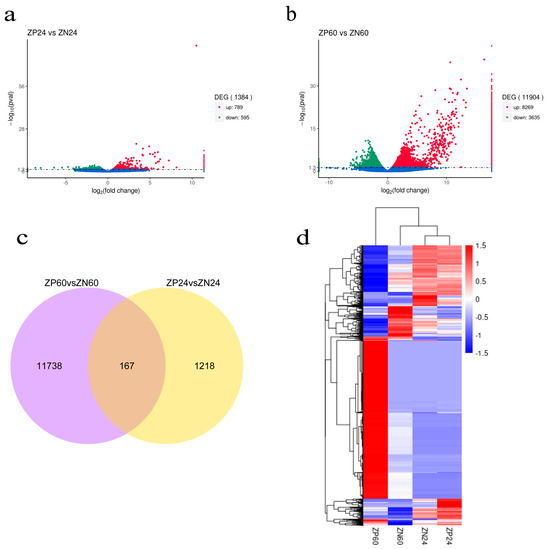Volcano, Venn plots and heatmap of DEGs. (a) Volcano plots of DEGs comparing ZP24 and ZN24 groups; (b) Volcano plots of DEGs comparing P60 and N60 h groups; the red spots in panels (a,b) depict over-DEGs, the green spots depict under-DEGs, whereas the blue spots refer to non-differentially expressed genes; (c) Venn plots of DEGs among the different comparisons; (d) DEG expression clustering. DEG expression values are represented through the color scale from blue to red.