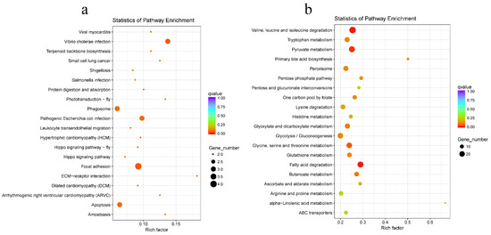 Scatter plot of KEGG enrichment analysis of DEGs. (a) Top 20 down-regulated KEGG pathways between ZP24 and ZN24. (b) Top 20 up-regulated KEGG pathways between ZP60 and ZP24. The larger the Rich factor, the greater the degree of enrichment. The value range of the q value is (0,1). The closer it is to zero, the more significant the enrichment is. Pathways with q ≤ 0.05 are defined as pathways that are significantly enriched in DEGs.