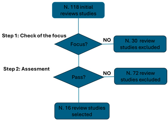 Figure 1 shows the process of selecting review studies based on the focus and the selection procedure, which also prioritizes the recency of publication. Starting from 118 studies published since 1999, 88 review studies were identified based on the focus. Subsequently, after applying the procedure, 16 review studies were identified [20,21,22,23,24,25,26,27,28,29,30,31,32,33,34,35].