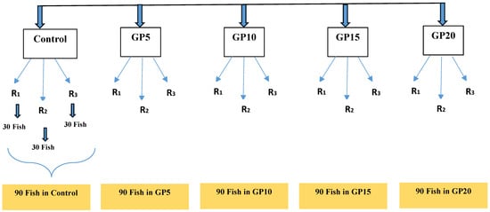 Experimental design depicting the number of replicates and the experimental fish. Four hundred and fifty fingerlings (average initial weight: 20.5 g) were randomly divided into five experimental groups. One group, represented as the control, was fed with a control diet for 120 days. The other four groups were fed a diet supplemented with different inclusion levels of GP: 5 g (GP5), 10 g (GP10), 15 g (GP15), and 20 g (GP20) per kg of the control diet. Each group was maintained in three replicates (indicated as R1, R2, and R3) outdoors in cemented experimental tanks (20 m2) with a capacity of 20,000 L of water. Each replicate contained 30 fish.