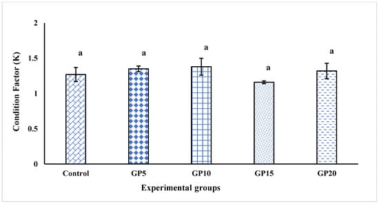 Effects of feeding experimental diets for 120 days on the condition factor (K) of Labeo rohita. The data are presented as mean ± standard error of the three replicates. The bars with different letters indicate significant differences (p < 0.05). Control (the basal diet with no GP); GP5 diet (supplemented with GP at 5 g kg−1 of the basal diet); GP10 (supplemented with GP at 10 g kg−1 of the basal diet); GP15 (supplemented with GP at 15 g kg−1 of the basal diet); GP20 (supplemented with GP at 20 g kg−1 of the basal diet).