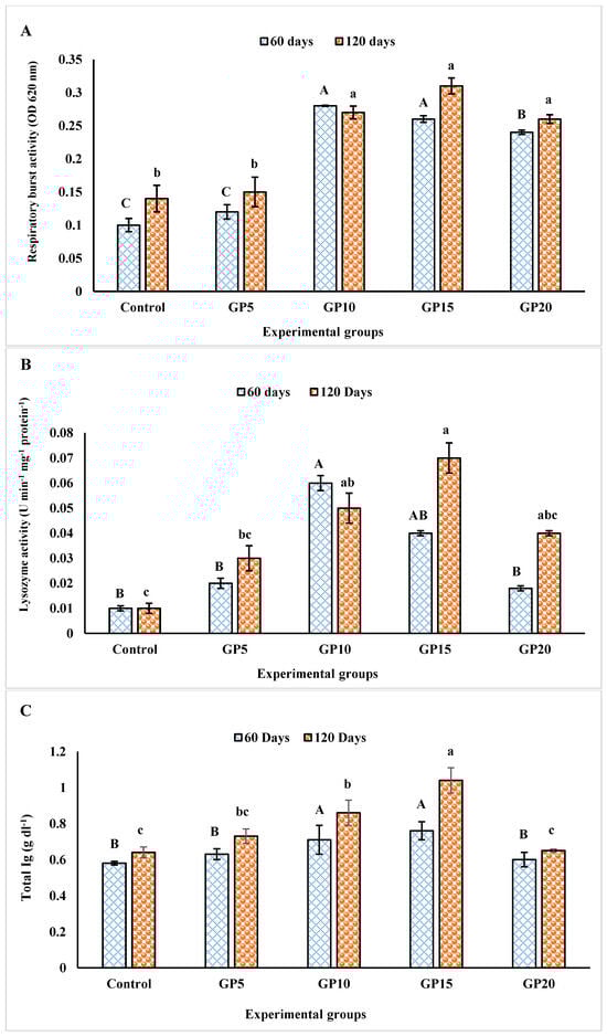 Effects of feeding experimental diets for 60 and 120 days on the (A) respiratory burst activity, (B) lysozyme activity, and (C) total immunoglobulin (Ig; g dL−1) level in the serum of the L. rohita. The bars with different alphabet letters (capital and small letters for day 60 and day 120 sampling points, respectively) represent significant differences between the groups (p < 0.05). The data are presented as mean ± standard error of the three replicates. For the experimental groups, please refer to Figure 2’s caption.