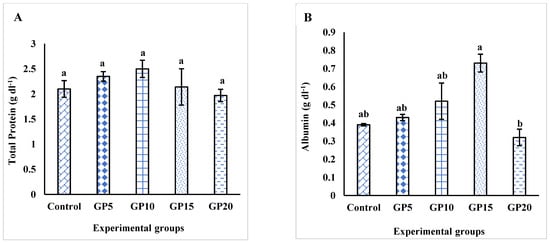 On day 120, the dietary GP had no significant effect on the total protein level or the globulin level, as shown in Figure 4A,C, respectively. However, albumin levels were notably higher in the GP15 group compared to all the experimental groups (Figure 4B). This increase was not significant when compared to the groups that were fed with control, GP5, or GP10 diets. In contrast, a significant difference in albumin levels was observed between the GP15 group and the GP20 group. Likewise, the GP15-fed group showed the highest albumin/globulin ratio among all the groups, approximately 2.5 times higher than the control group. However, the difference was not statistically significant.
