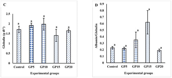 Effects of feeding the experimental diets for 120 days on the (A) total protein (g dL−1), (B) albumin (g dL−1), (C) globulins (g dL−1), and (D) albumin/globulin (A/G) level in the serum of L. rohita. The bars with different letters indicate significant differences (p < 0.05). The data are presented as mean ± standard error of the three replicates. For the experimental groups, please refer to Figure 2’s caption.