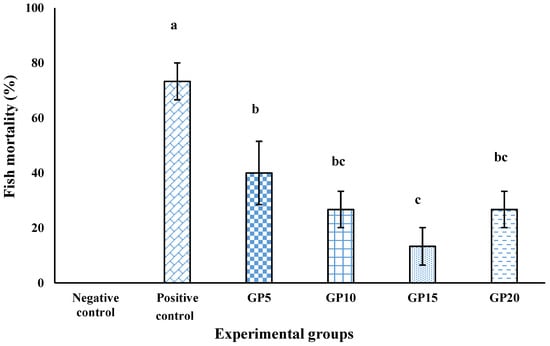 Mortality (%) of the L. rohita challenged with A. hydrophila for a period of 15 days. The L. rohita were fed with various experimental diets for 120 days, as indicated in Figure 2’s caption. After these 120 days, the fish were challenged with A. hydrophila, and the mortality was recorded over a 15-day duration. The bars with different letters indicate significant differences (p < 0.05). A group of fish that were not fed with GP and were not subjected to the A. hydrophila challenge served as the negative control. The control group, which received the control diet and was exposed to A. hydrophila, served as the positive control.