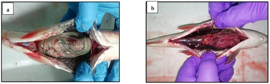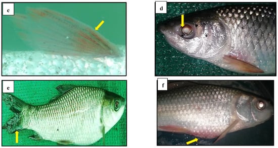 Clinical signs observed during the 15-day challenge trial involving the L. rohita exposed to A. hydrophila. For the experimental groups, please refer to Figure 2’s caption. A group of fish that were not fed with GP and were not subjected to the A. hydrophila challenge served as the negative control. The control group, which received the control diet and was exposed to A. hydrophila, served as the positive control. (a) Negative control: normal structure of internal organs, (b) positive control: inflammation of internal organs, (c) hemorrhages on fins, (d) reddish eye, (e) hemorrhages on the tail, and (f) hemorrhages on the ventral side.