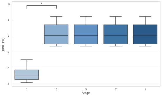 Body weight losses after stages 1, 3, 5, 7, and 9. Dehydration threshold settled at <−2%. BWL: body weight loss; * p < 0.05.